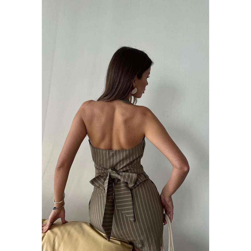 ชุดเสื้อกั๊กแขนกุดลายทางสีกากีและกระโปรงขายส่ง สไตล์มินิมอลสำหรับผู้หญิง ผ้าเครปเป็นมิตรกับสิ่งแวดล้อม สไตล์นอร์มคอร์