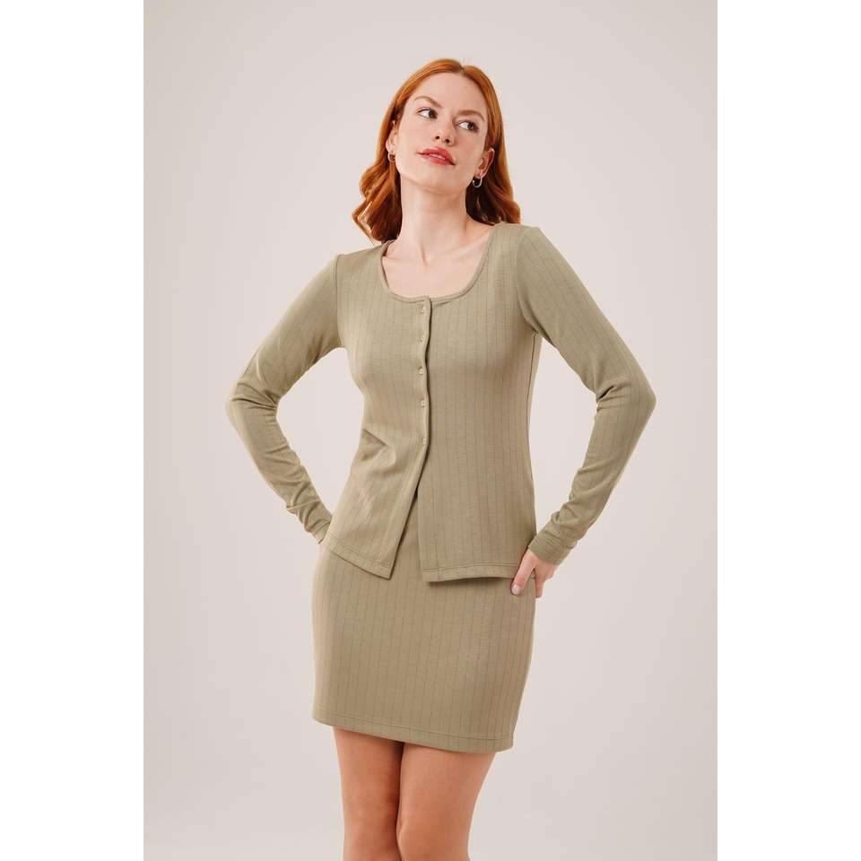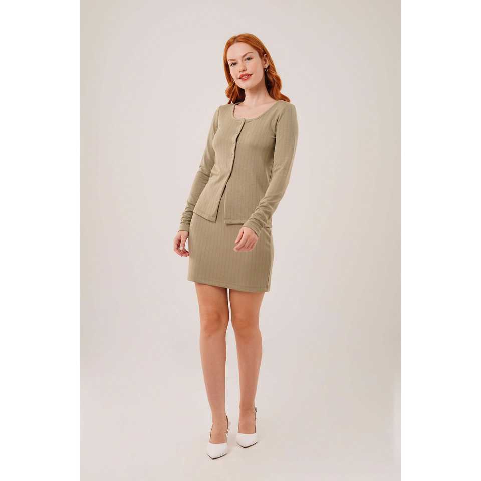ชุดลำลองสองชิ้นสีกากีขายส่ง กระโปรงลายทางและเสื้อเชิ้ตติดกระดุม ดีไซน์เรียบง่าย ผ้าถัก เทคนิคการปัก