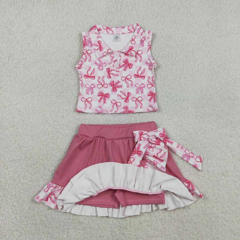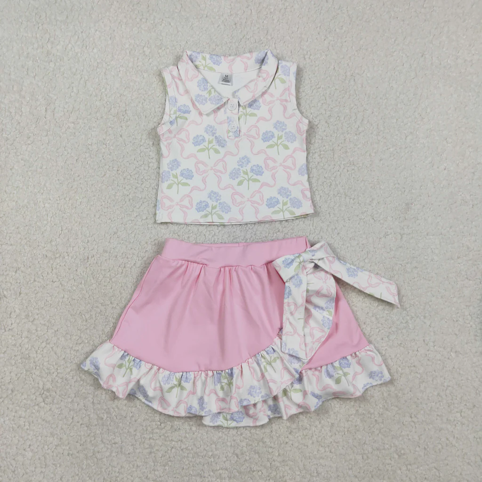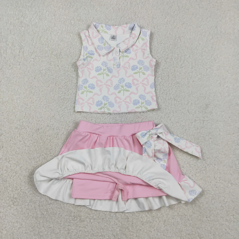 ชุดโยคะเด็กผู้หญิงขายส่ง ชุดฤดูร้อน 2 ชิ้น เสื้อกล้ามพิมพ์ลายไม่มีแขน พร้อมกระโปรงระบาย ชุดกีฬา