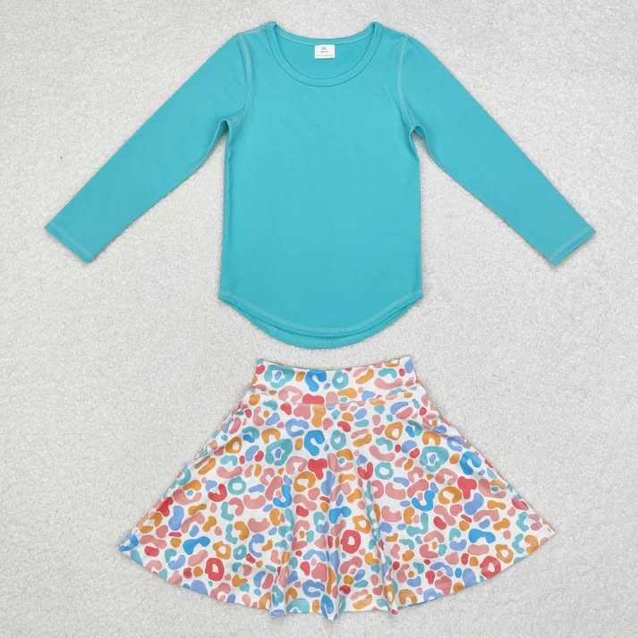 ชุดโยคะเด็กขายส่ง เสื้อสีพื้นและกระโปรงลายดอกเสือดาว ชุดสองชิ้นสำหรับเด็กผู้หญิง