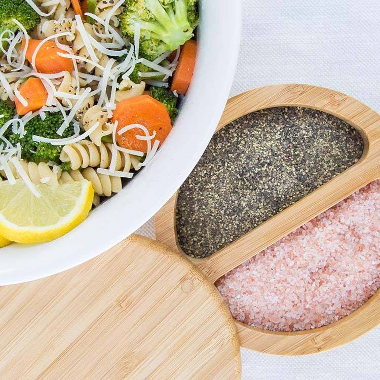 กล่องเก็บเครื่องเทศพริกไทยเกลือทรงกลมสองช่องทำจากไม้ไผ่พร้อมฝาปิดแม่เหล็กสำหรับขายส่ง