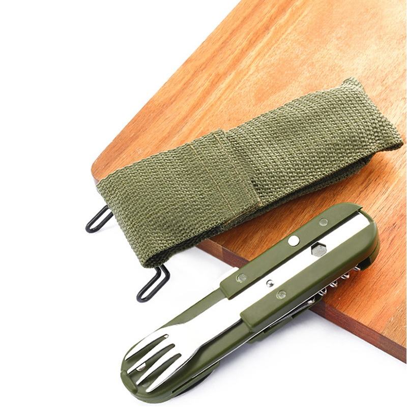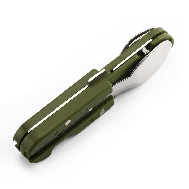 ชุดช้อนส้อมพับได้สแตนเลสสีเขียว LM สำหรับแคมป์ปิ้งปิกนิก พร้อมที่เปิดขวด