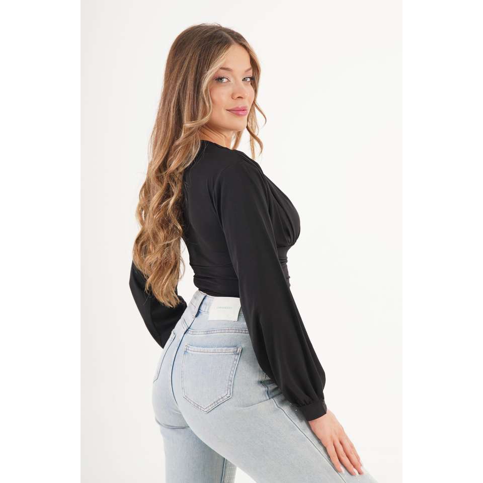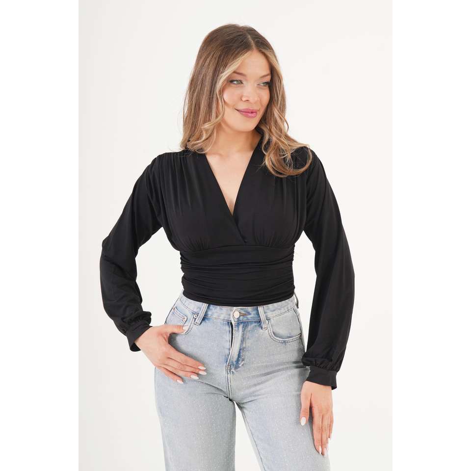 Wholesale Ladies' Black Satin Blouse Embroidered Korean Fashion Style Bust Draped V-Neck Free Size XL Long Short Length Options