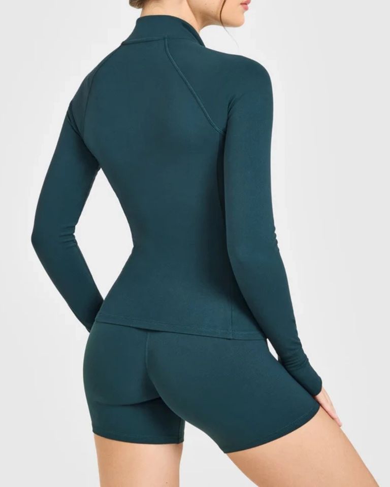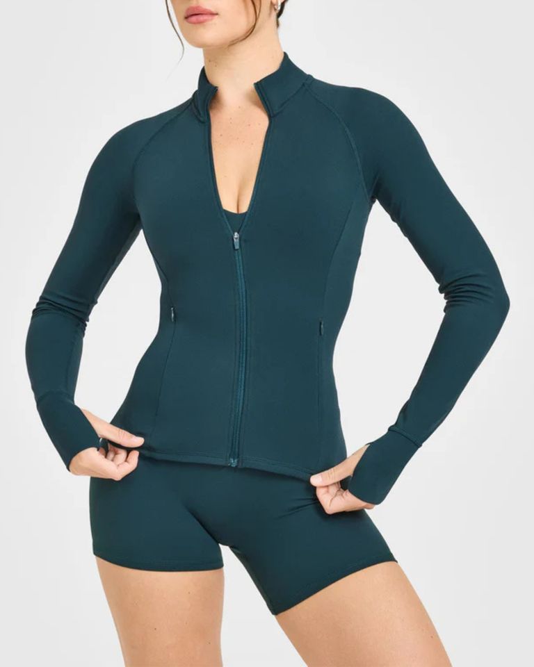 เสื้อแจ็คเก็ตโยคะผู้หญิงแบบขายส่ง แห้งเร็ว กระชับสัดส่วน คอตั้ง ซิปยาว รูสอดนิ้วโป้ง ทรงเข้ารูป สำหรับวิ่งและออกกำลังกาย