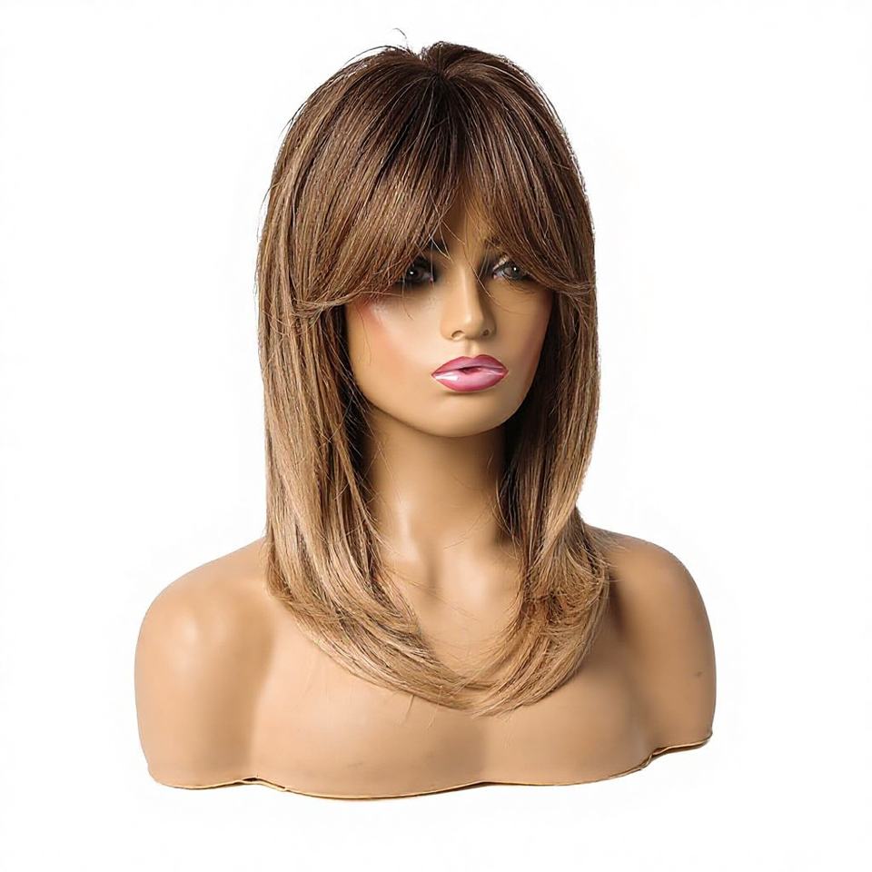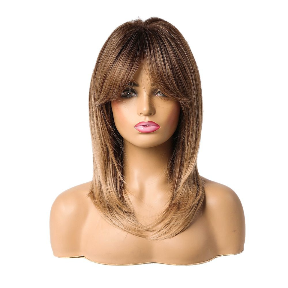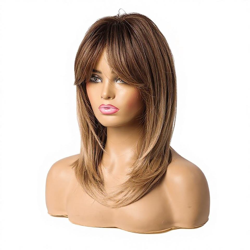วิกผมบ๊อบไล่เฉดสีน้ำตาลสำหรับผู้หญิง ขายส่ง ทรงผมตรงยาวปานกลาง มีหน้าม้าปัดข้าง แบบเลเยอร์ ทนความร้อน ทำจากเส้นใยทนความร้อนสูง