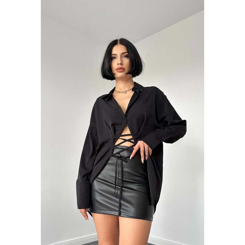 เสื้อเชิ้ตผู้หญิงสไตล์เรโทรแบบผูกเชือก แบรนด์ Jessica ลายปะติดปะต่อ ไซส์ฟรี XL ผ้าถักทอสีดำล้วน สำหรับฤดูใบไม้ผลิและฤดูใบไม้ร่วง ขายส่ง