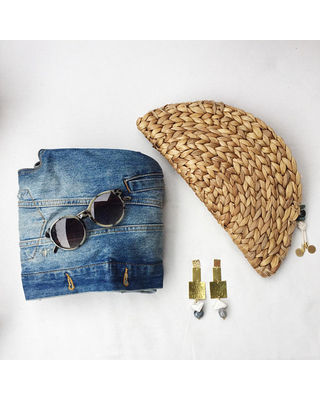 กระเป๋าคลัทช์น้ำผักตบชวาของผู้หญิงกระเป๋าวินเทจจัดการลำลองมีซับในผ้าฝ้ายและลายดวงจันทร์ครึ่ง