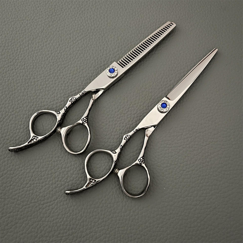 กรรไกรตัดผมสำหรับคนถนัดซ้ายแบบขายส่ง ขนาด 6 นิ้ว ด้ามจับลายดอกพลัม กรรไกรซอยผมสำหรับใช้ในงานเสริมสวย