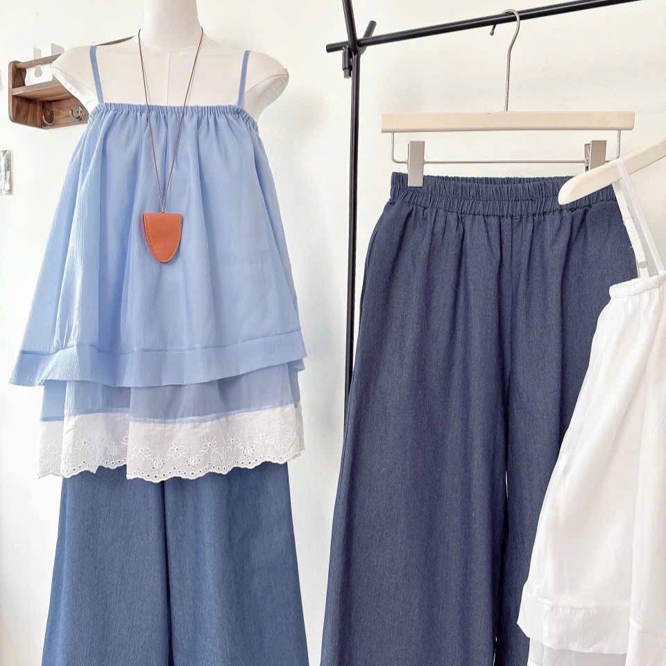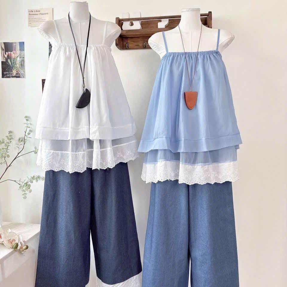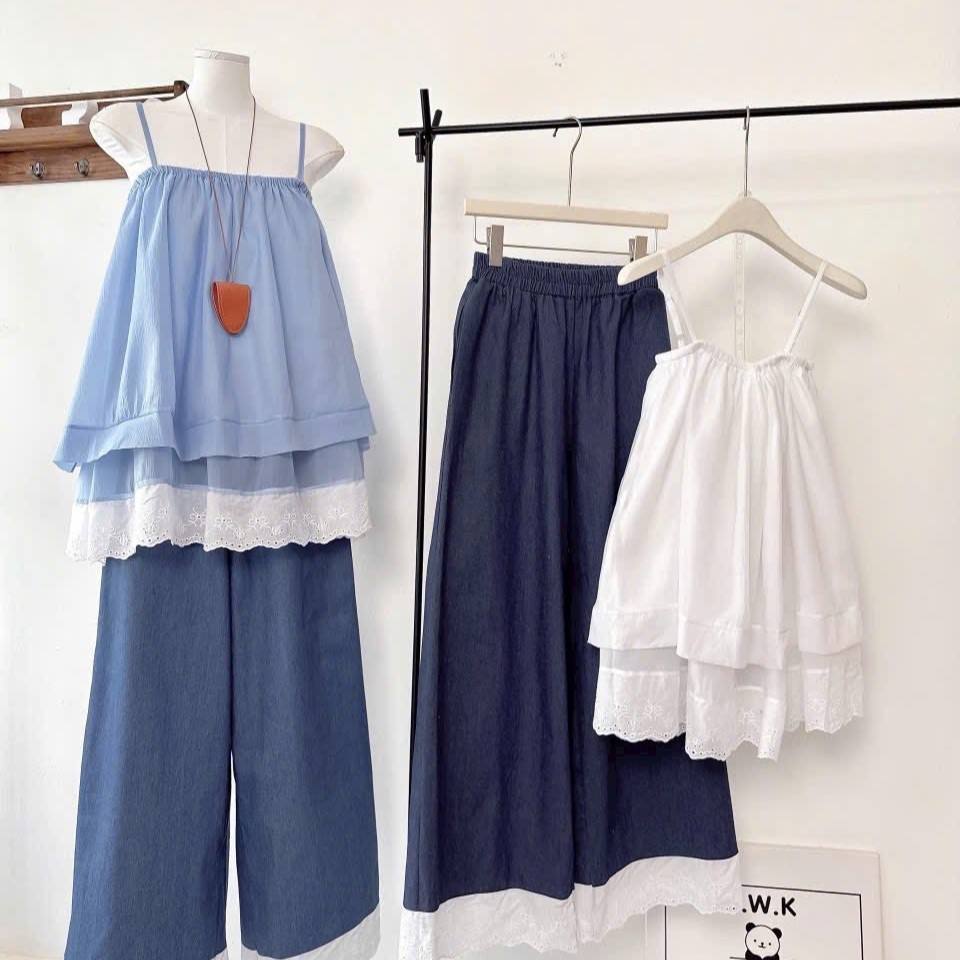 ชุดเซ็ตฤดูร้อน เสื้อสายเดี่ยวชีฟองบางเบาแบบหลายชั้น พร้อมกางเกงขาสั้นเอวยางยืด ขายส่ง