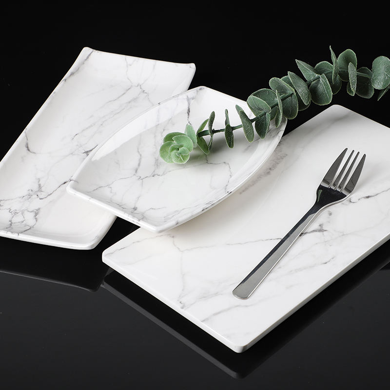 เมลามีนแบบวางซ้อนกันได้สำหรับโต๊ะอาหารและตั้งแคมป์พิมพ์ลายหินอ่อนน้ำหนักเบาทนทานต่อรอยขีดข่วน