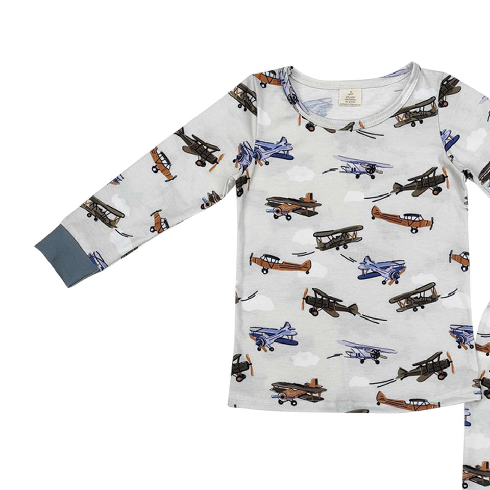 ชุดเสื้อผ้าพิมพ์ลายเครื่องบินสำหรับเด็กผู้ชายวัยหัดเดินชุดเสื้อผ้าชุดนอนแขนยาวลายบูติกสำหรับเด็ก
