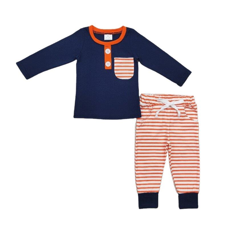 ชุดเสื้อผ้าพิมพ์ลายทางสีน้ำเงินเข้มสำหรับเด็กผู้ชายวัยหัดเดินชุดนอนแขนยาวสำหรับฤดูใบไม้ร่วง