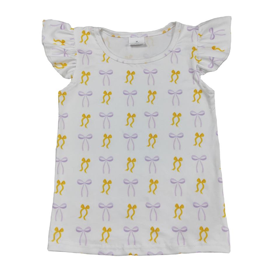 ชุดเสื้อผ้าสำหรับเด็กวัยหัดเดินแขนสั้นพิมพ์ลายโบว์สีม่วงและเสื้อบูติกสำหรับเด็กผู้หญิงตัวเล็ก