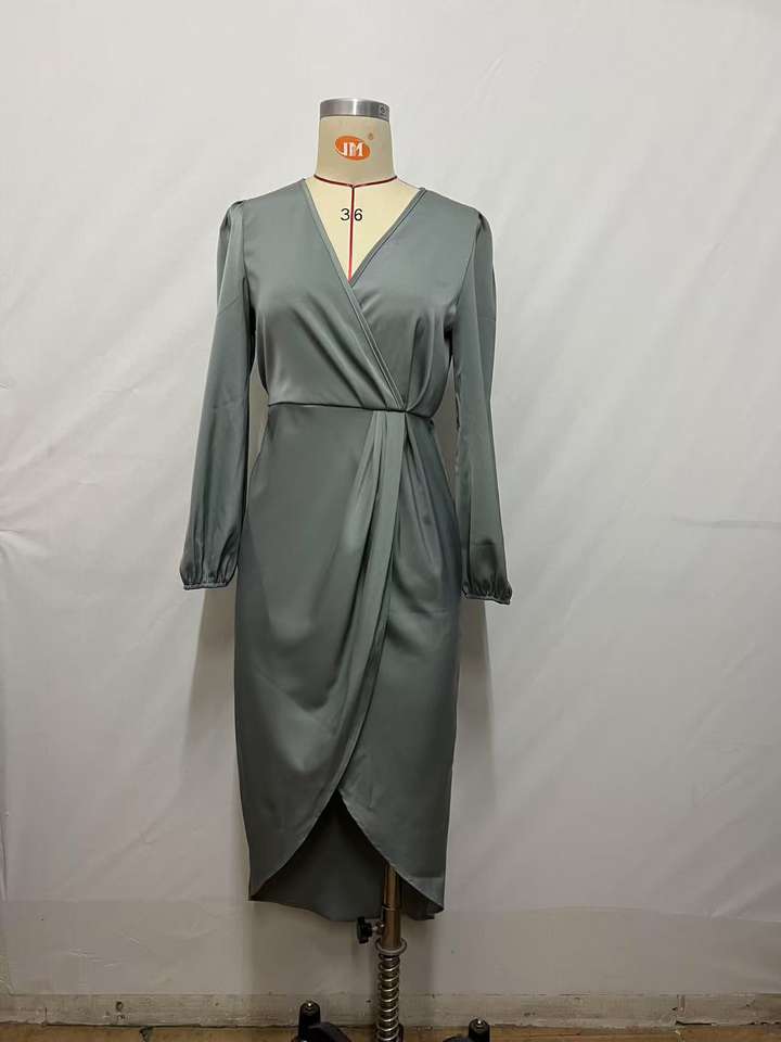 เดรสผ้าซาตินแขนยาวสำหรับใส่ทำงานในสำนักงานชุดเดรสผ้าซาตินมีจีบสำหรับออกงานกลางคืนชุดเดรสคอวีแบบไขว้
