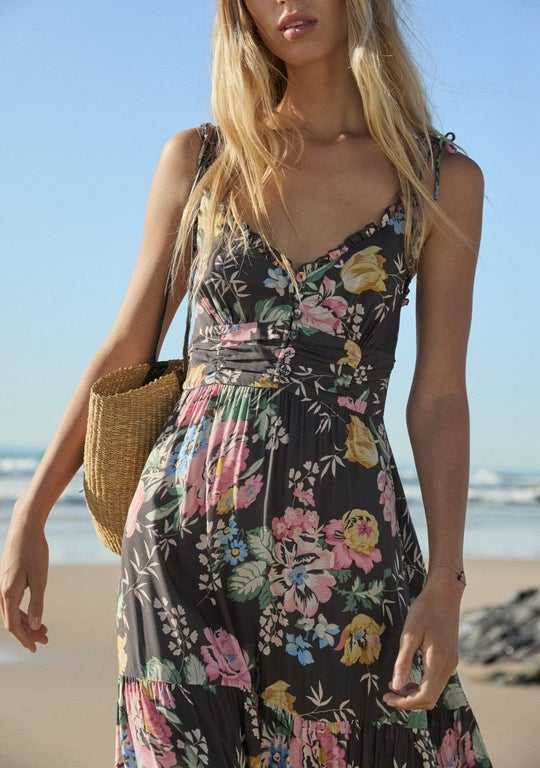 เดรสยาวผ้าลื่นสำหรับผู้หญิงเดรสแม็กซี่ลายดอกไม้สไตล์โบฮีเมียนแขนกุดพิมพ์ลายดอกไม้