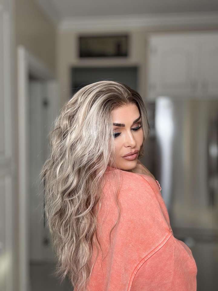 วิกผมลูกไม้แบบยาว 20 นิ้ว สีบลอนด์ประกายเทา แบบลอนคลายธรรมชาติ ไม่ต้องใช้กาว ติดง่าย ทนความร้อน วิกผมสังเคราะห์ HD คุณภาพสูง ขายส่ง