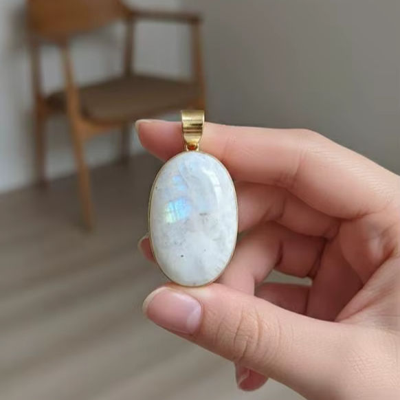 สร้อยคอจี้ทำมือแบบขายส่งสำหรับผู้หญิง จี้รูปพระจันทร์สีรุ้งธรรมชาติ จี้ทำมือจากวัสดุธรรมชาติ