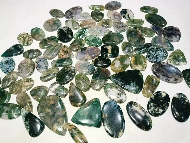 อัญมณีไฟสีฟ้าทรงหลังเบี้ยลายมอสธรรมชาติหินโมราอัญมณีสีตกแต่งทรงแตกต่างกัน