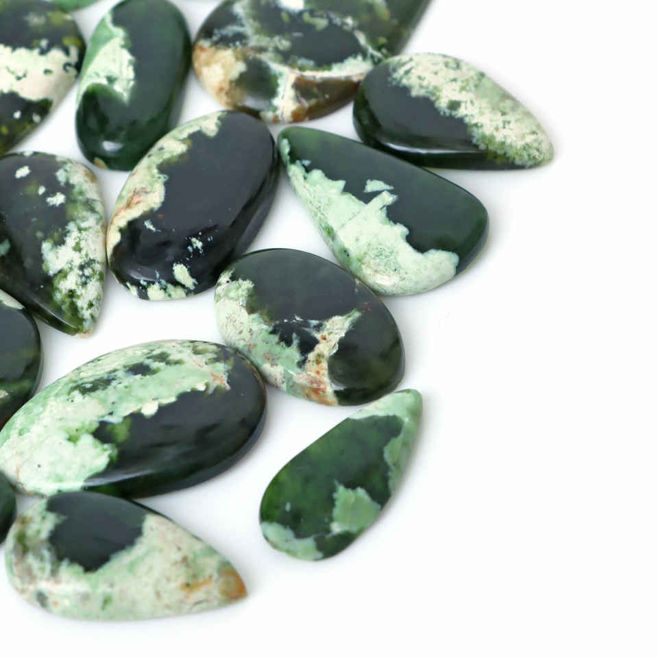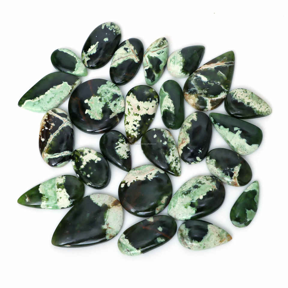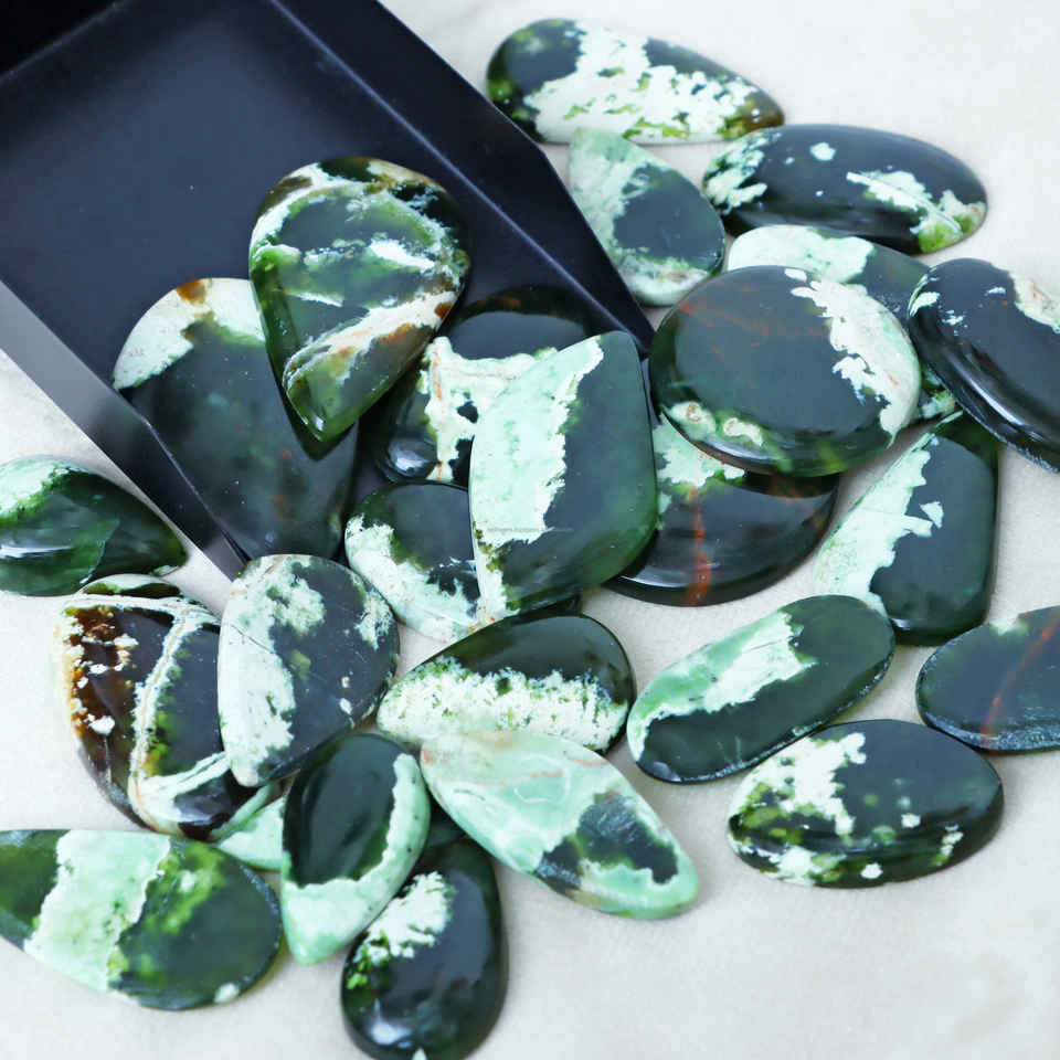 พลอยคาลซิโดนีสีเขียวโครมธรรมชาติแบบขายส่ง คุณภาพสูง เปลี่ยนสีได้ แบบหลังแบน สำหรับทำเครื่องประดับเงิน