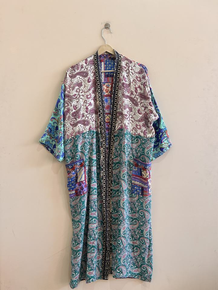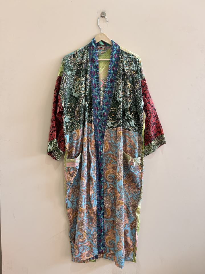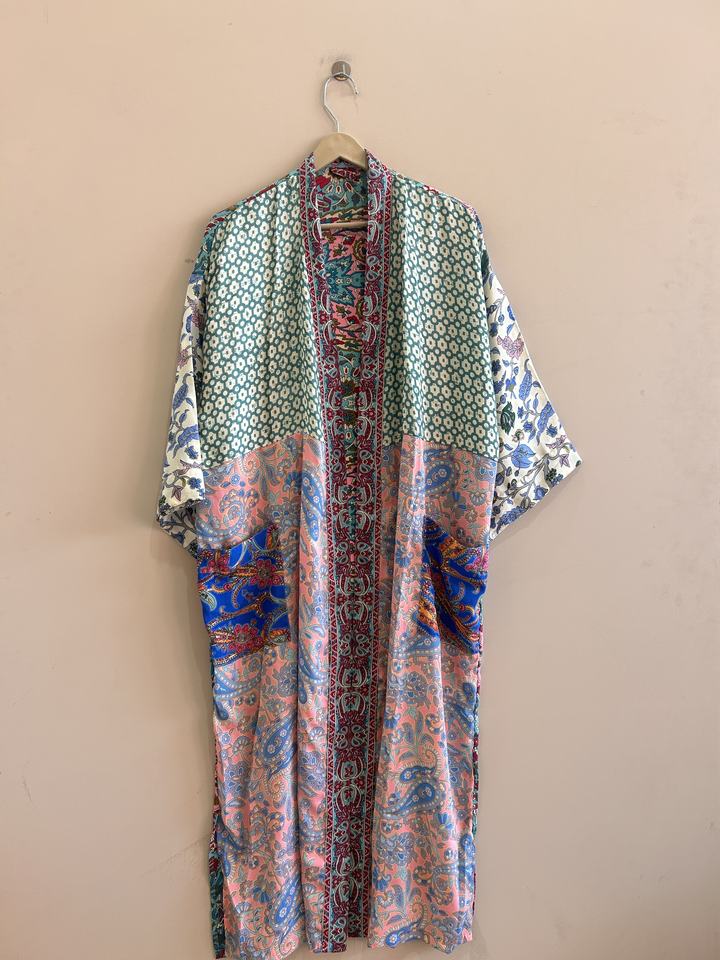 ชุดคลุมกิโมโนผ้าไหมอินเดียลายปะติดปะต่อสำหรับผู้หญิง ขายส่งจำนวนมาก ผ้าโพลีซิลค์ ชุดคลุมยาวสำหรับวันหยุดพักผ่อน ชุดชายหาด