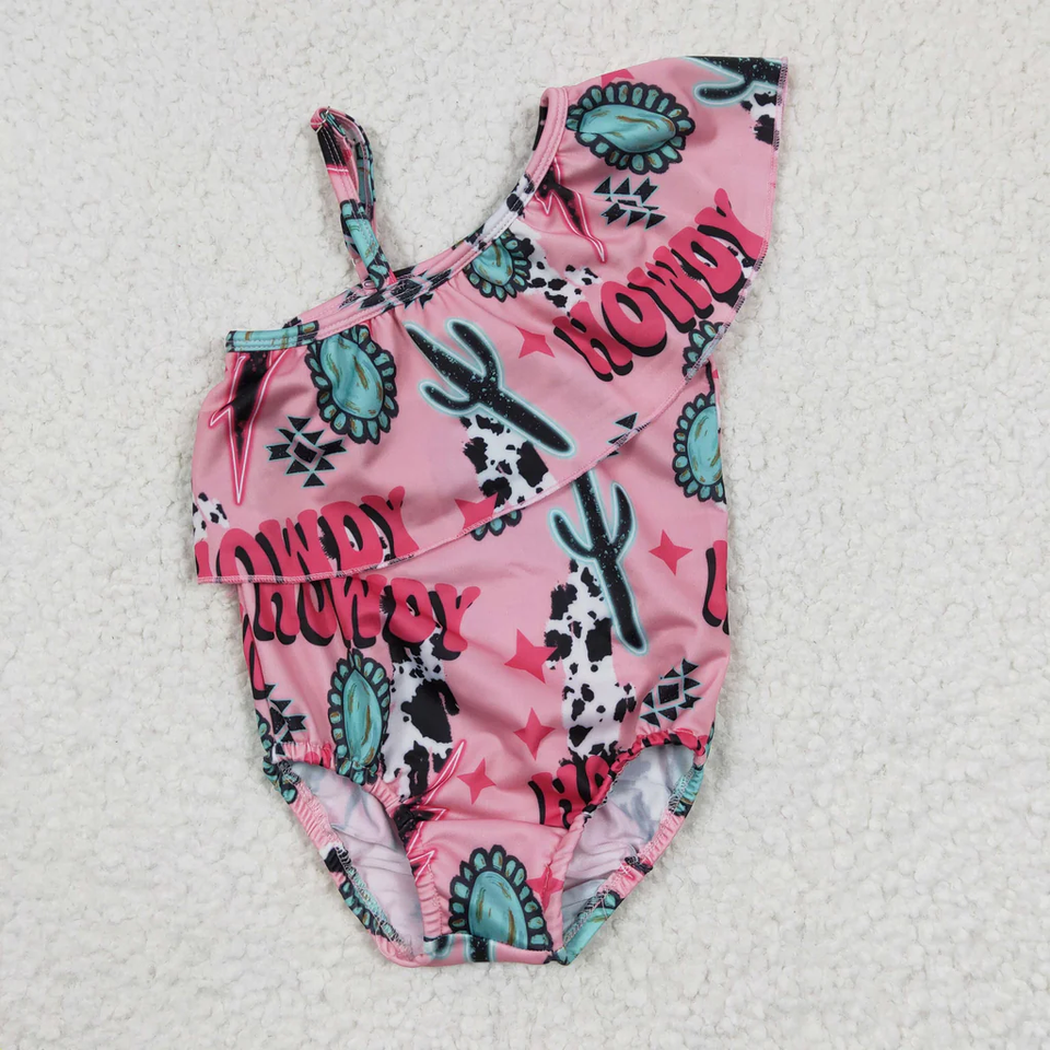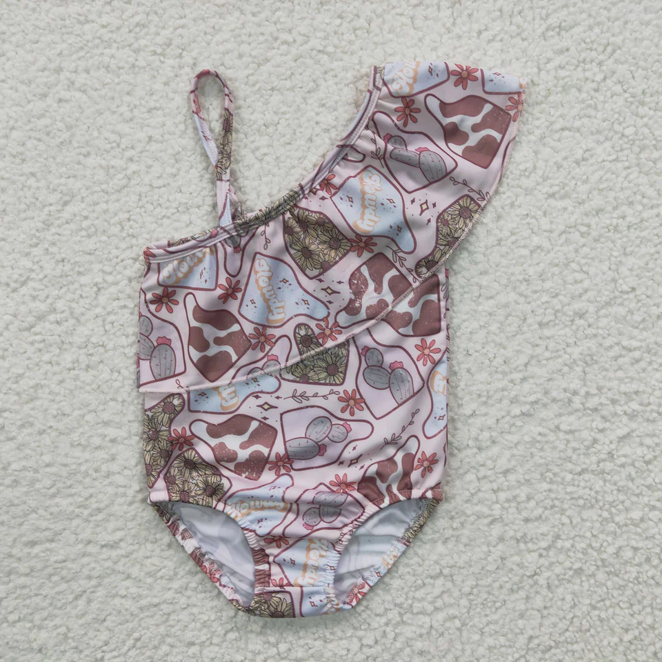ชุดว่ายน้ำเด็กผู้หญิงแบบชิ้นเดียว ลายพิมพ์สไตล์ตะวันตก แต่งระบาย สายเดี่ยว นุ่ม ระบายอากาศได้ดี ขายส่ง