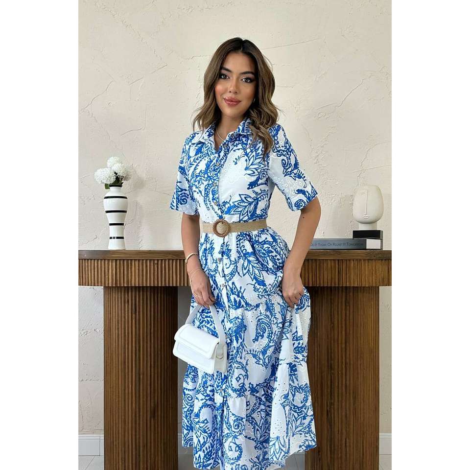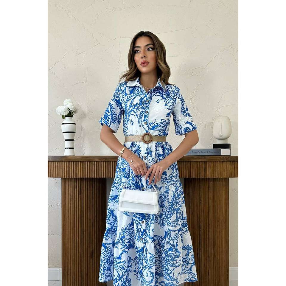 ชุดเดรสปักลายหรูหราสีน้ำเงิน แขนผูกเชือก ลายดอกไม้และลายเรียบ ผ้ายีนส์ ความยาวระดับเข่า สำหรับฤดูใบไม้ร่วง (ไซส์ XS ถึง XL)