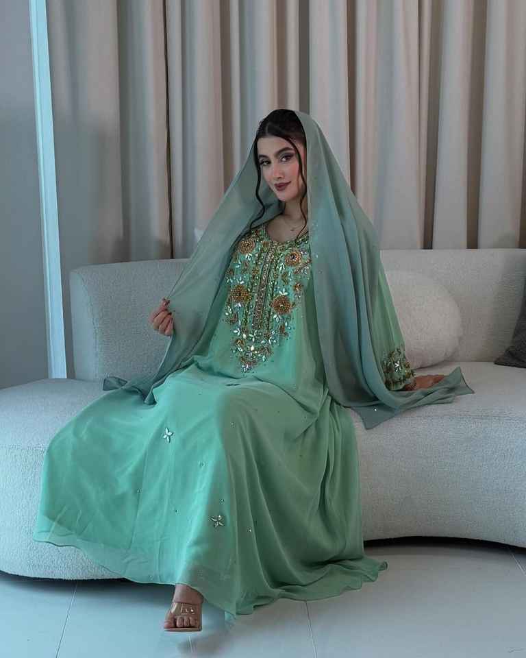 ชุดเดรสยาว 2 ชิ้น ผ้าชีฟองประดับลูกปัด คอวี มีบราในตัว ทรงเอไลน์ สำหรับงานปาร์ตี้ สไตล์มุสลิม เรียบหรู ขายส่ง