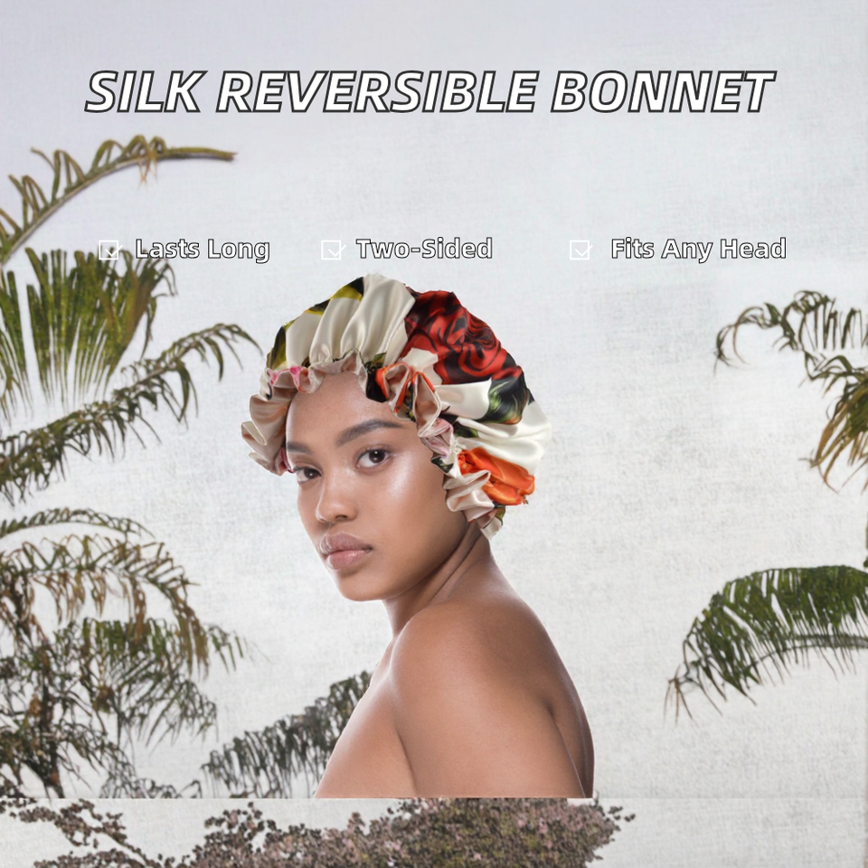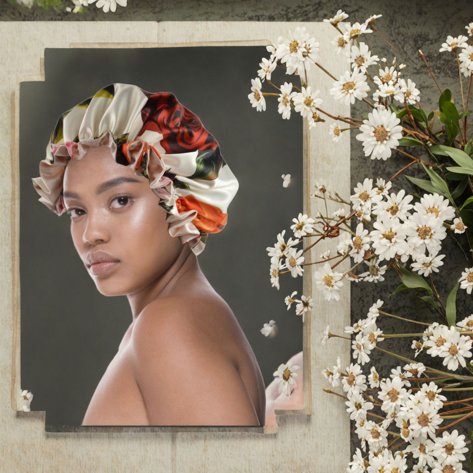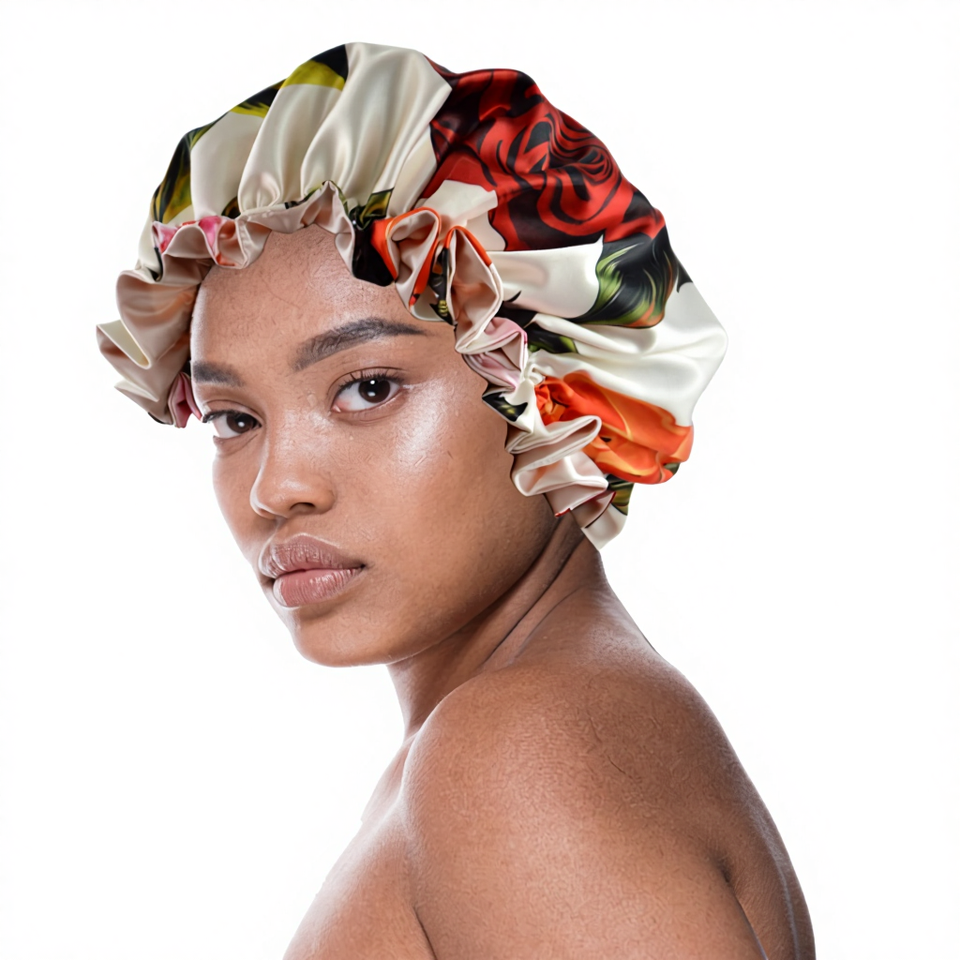 หมวกคลุมผมไหมซาตินลายดอกไม้สองชั้นแบบปรับได้ ขายส่ง คุณภาพหรูหรา ขอบระบายสีพื้น สำหรับนอนหลับและเดินทาง