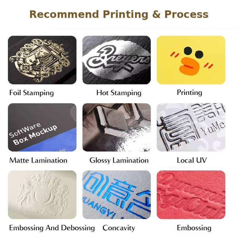 การจัดการการพิมพ์:แมตต์เคลือบ, เคลือบเงา, การตอก, ลายนูน, เคลือบเงา, เคลือบยูวี, หายไป, ทองฟอยล์