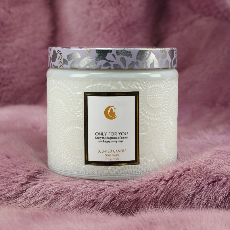 เทียนหอมในขวดแก้วลายนูนทองหรูหราขายส่ง | เทียนหอมถั่วเหลือง 250 กรัม สำหรับตกแต่งบ้าน ผู้จำหน่าย MOQ ต่ำ