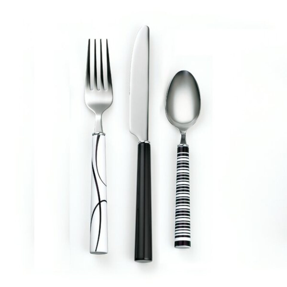 ชุดช้อนส้อมเครื่องเงินชุดเครื่องใช้บนโต๊ะอาหารแบบทันสมัยมีด้ามจับทำจากเรซินสีดำและสีขาว