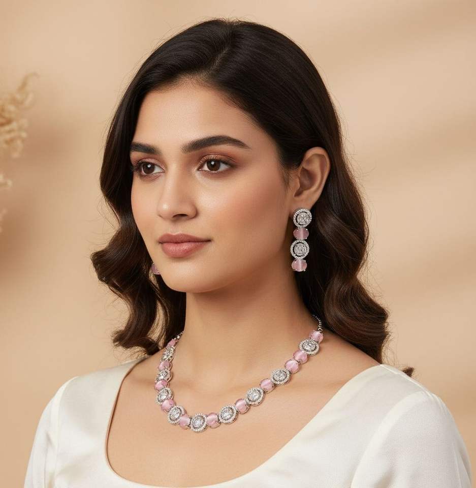 ชุดเครื่องประดับเพชรหรูหราสำหรับผู้หญิง ประกอบด้วยสร้อยคอและต่างหูประดับด้วยหินสีขาวและเพชรชมพู เหมาะสำหรับงานปาร์ตี้