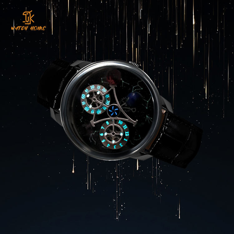 นาฬิกาข้อมือผู้ชายสุดหรูแบบอัตโนมัติ Astronomia ดีไซน์อวกาศ โลกหมุนได้ โปร่งใส ระบบกลไก รับผลิตตามสั่ง แบรนด์ OEM
