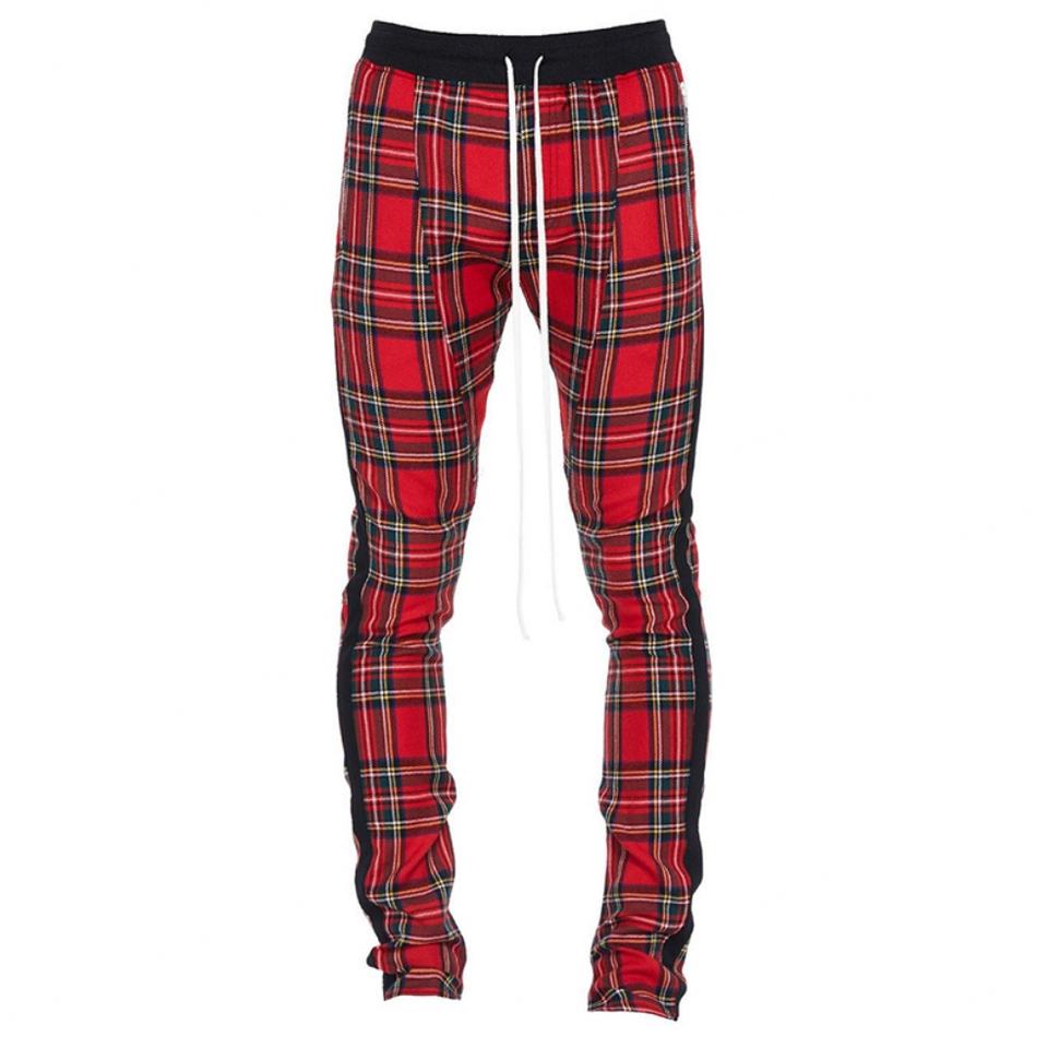 กางเกงวอร์มขายส่งลายสก็อตสีแดงสำหรับผู้ชายแบบมีซิปที่ข้อเท้า มีแถบข้างทรงสลิมฟิต