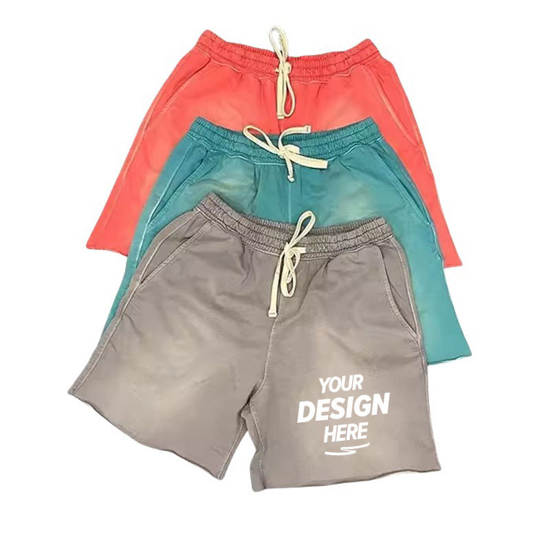 กางเกงขาสั้นผ้าฝ้ายผู้ชายขายส่ง ปักโลโก้ได้ ขอบตัดแบบซันเฟด ล้างสีแบบแอซิดวอช เอวกลาง ลายเรียบ
