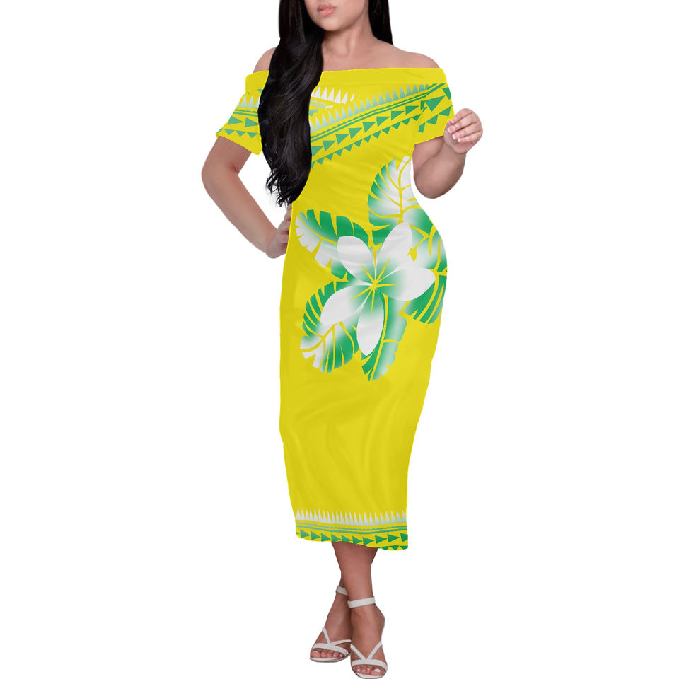 ผู้ผลิตเสื้อผ้าโพลีนีเซียนขายส่ง ชุดเดรสลายชนเผ่าแบบเปิดไหล่ แขนสั้น ชุดลำลองสไตล์เม็กซิกัน