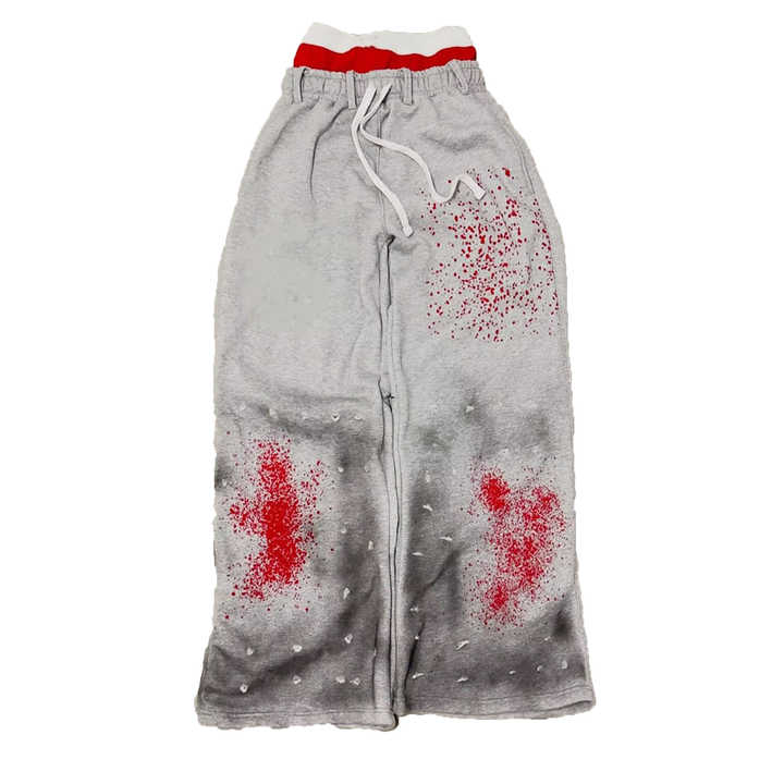 ผู้ผลิตขายส่งกางเกงขายาวแบบสั่งทำพิเศษ ลายเพ้นท์สีสาด ลุคทำสีซีดแบบแอซิดวอช กางเกงสเวตแพนท์ทรงหลวม เอวสองชั้น สำหรับผู้ชาย