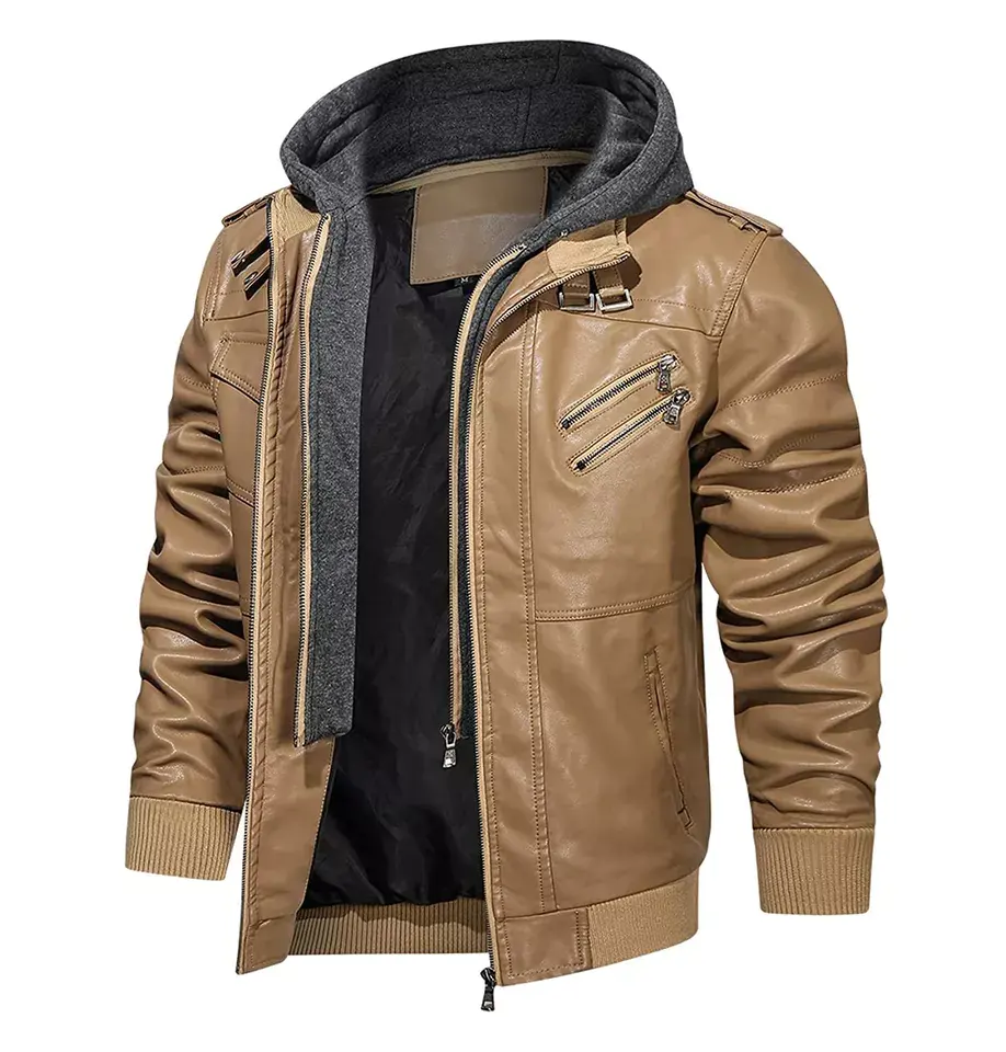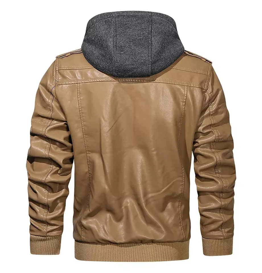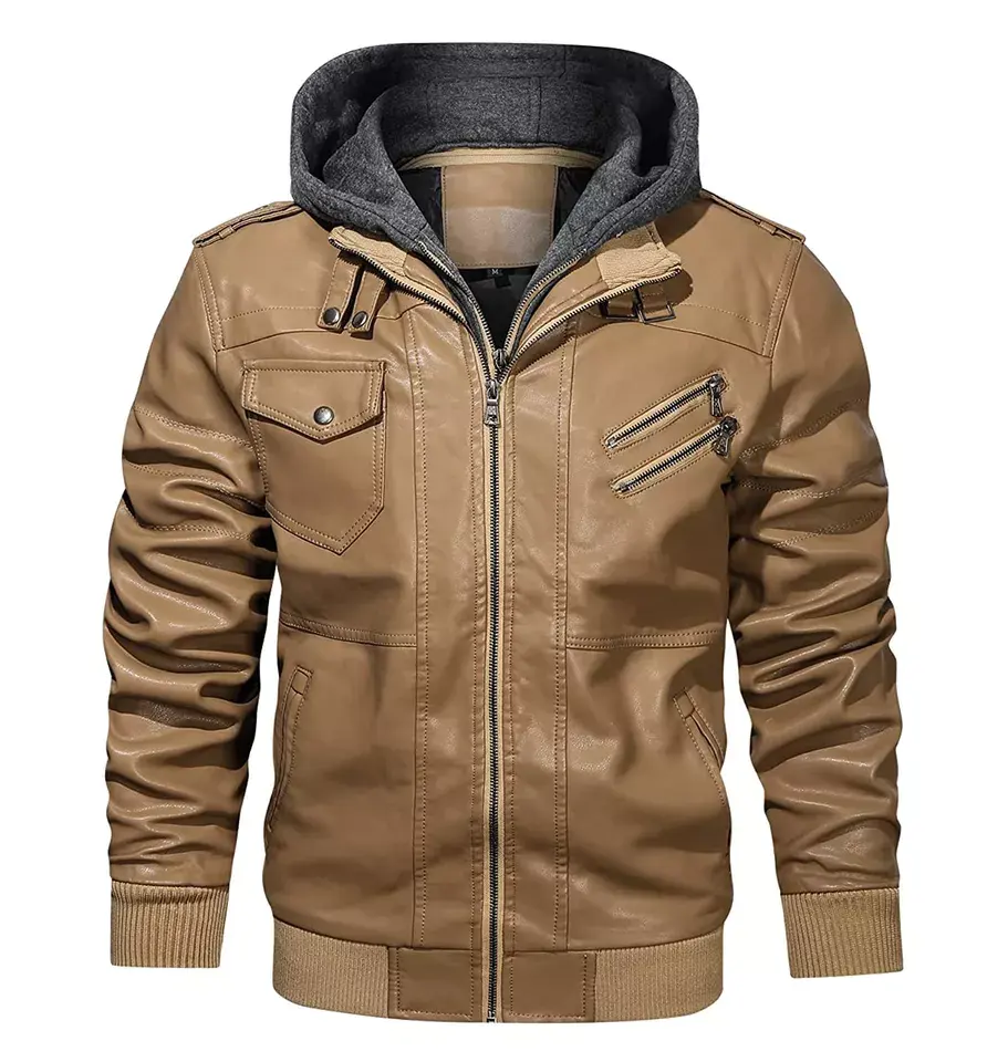 เสื้อแจ็คเก็ตหนังบอมเบอร์มีฮู้ดสำหรับผู้ชาย,เสื้อแจ็คเก็ตหนังแท้แฟชั่นมีฮู้ด