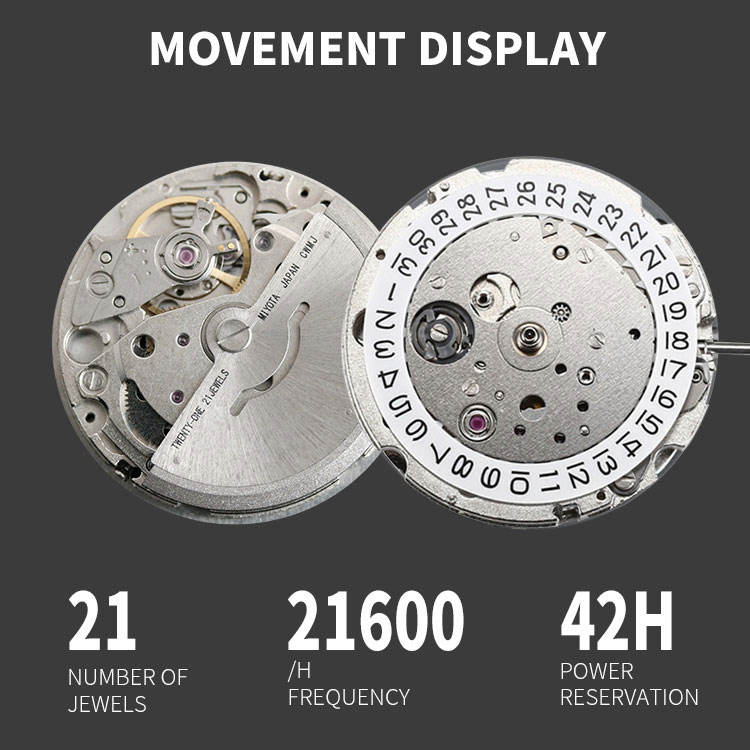 ลักษณะ:พลังงานสำรอง, กันน้ำ, เรืองแสง, มือส่องสว่าง, วัน / วัน, ออโต้วันที่, ปฏิทิน, วันที่
