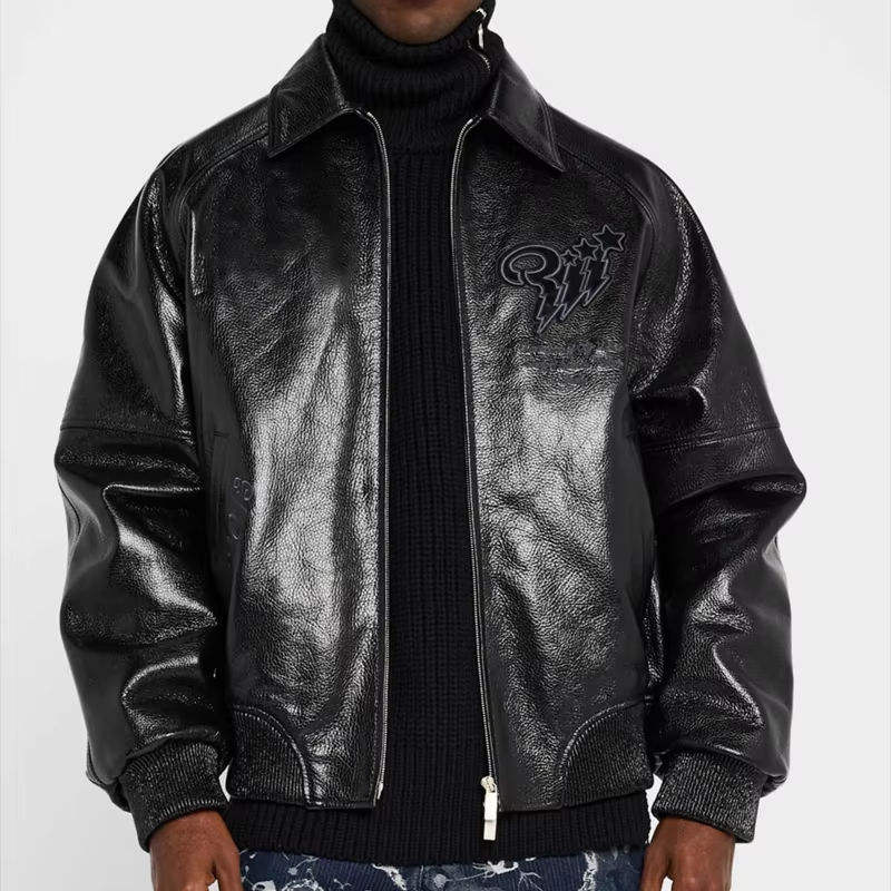 เสื้อแจ็คเก็ตหนังสีดำเงาสำหรับผู้ชาย ขายส่ง ปักลายได้ตามสั่ง สไตล์บอมเบอร์ แฟชั่นสตรีท ซิปหน้า ผลิตจากโรงงาน