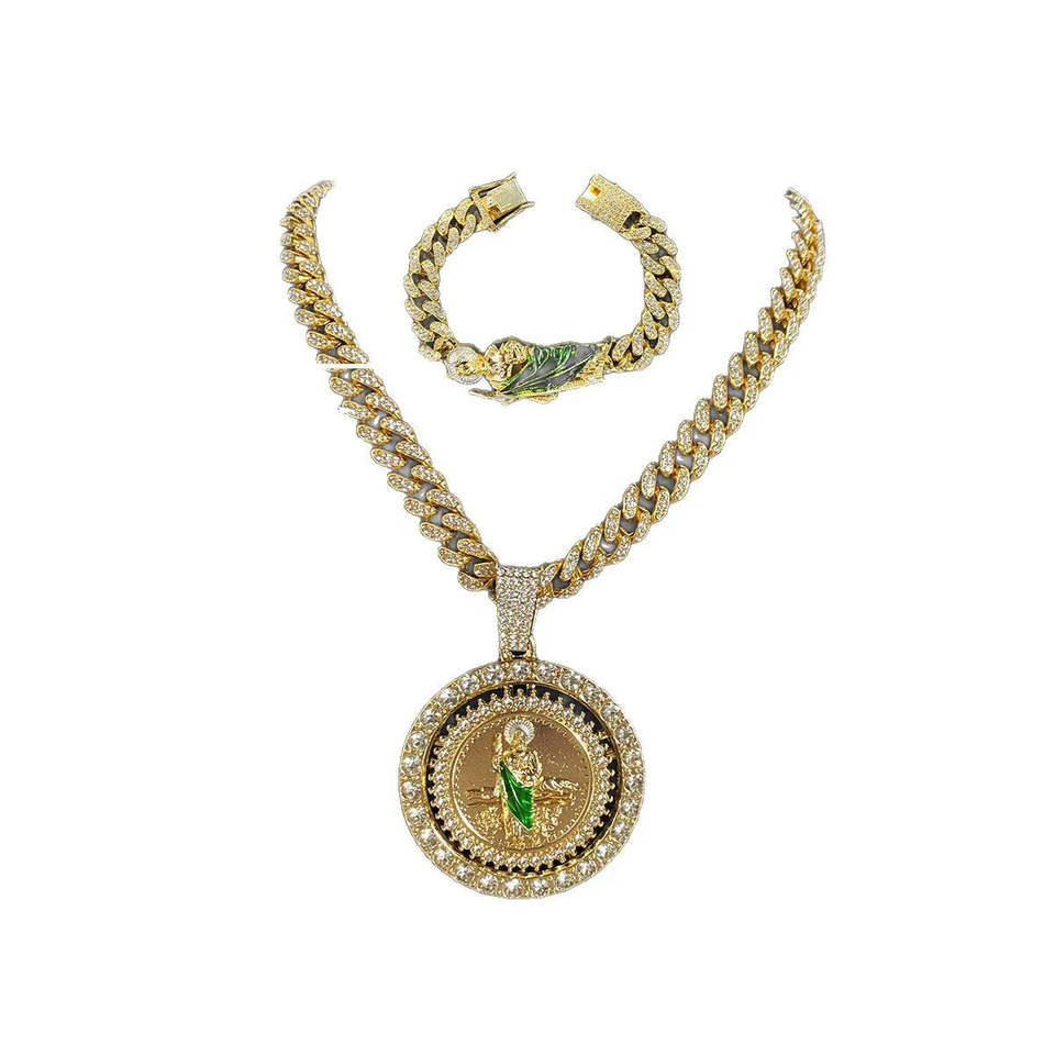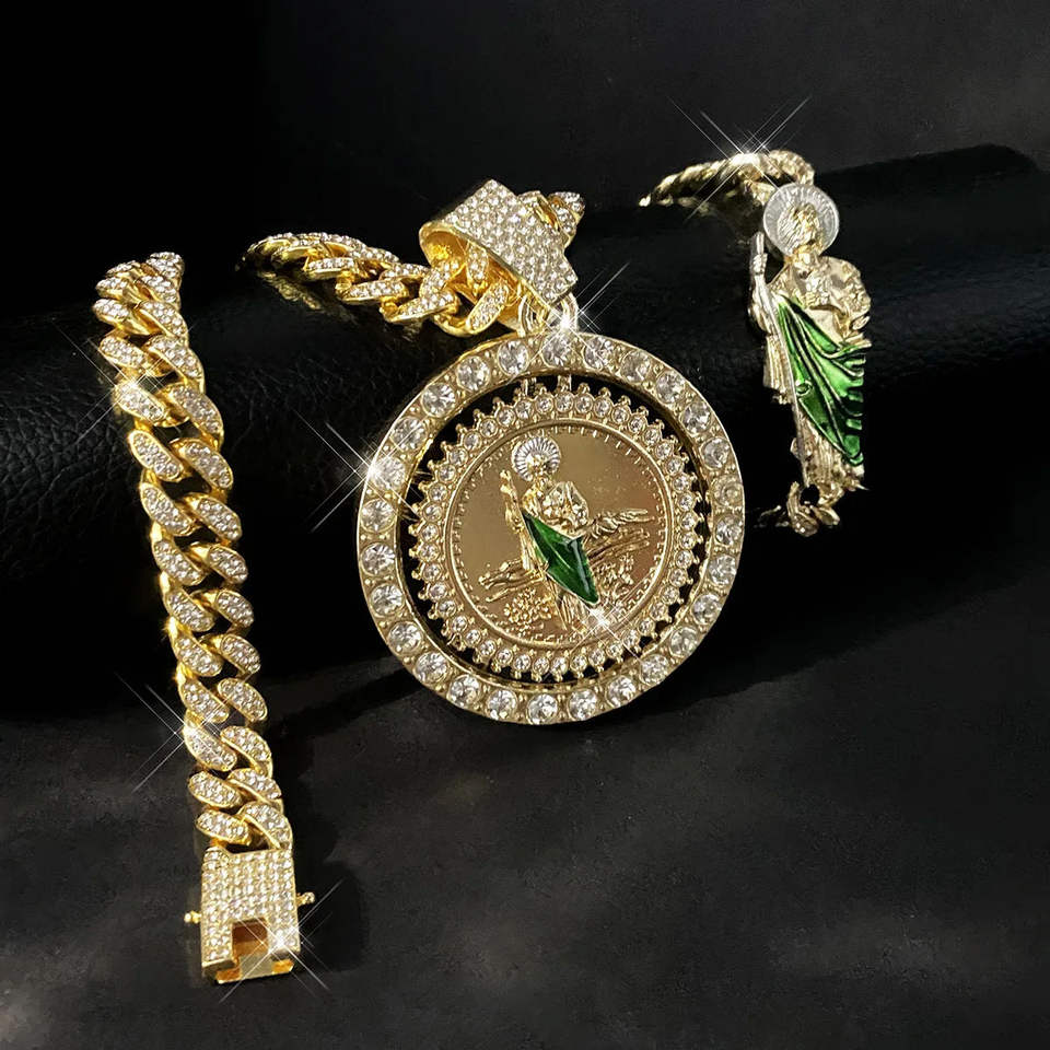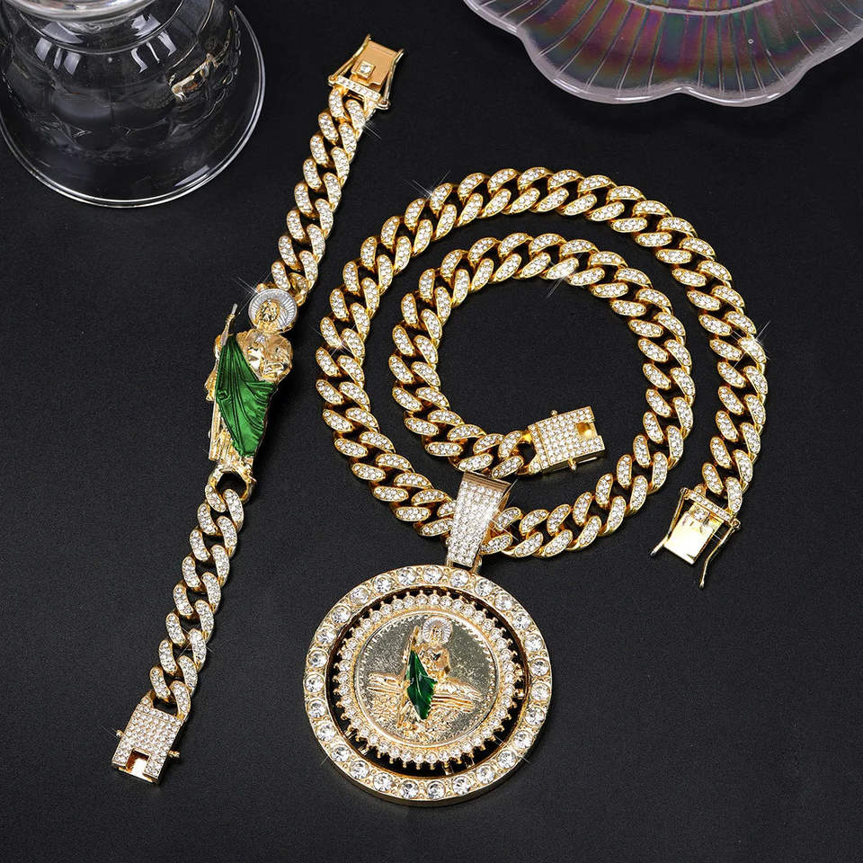 ชุดสร้อยคอจี้เพชรแบบหมุนได้ของฮิปฮอปสำหรับผู้ชายสร้อยข้อมือโซ่ร้อยเชือกสไตล์คิวบา