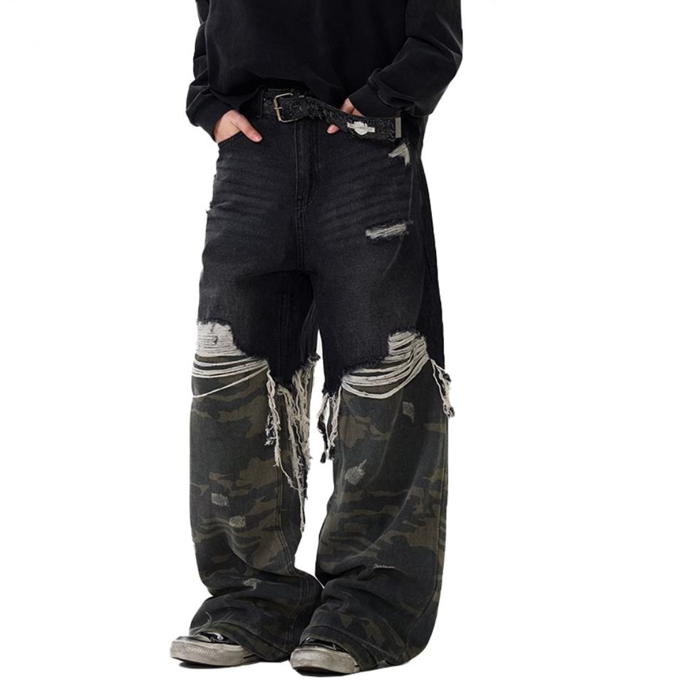 กางเกงขายส่งผู้ชายทรงหลวมสไตล์วินเทจลำลองแนวสตรีท ลุคขาดๆ ซักแบบวินเทจ ไซส์ใหญ่ ลายพรางแบบปะติด