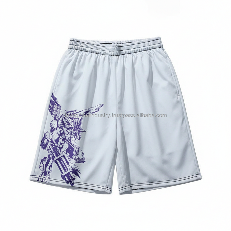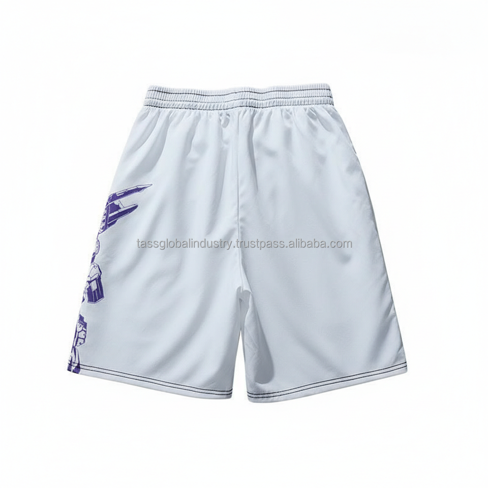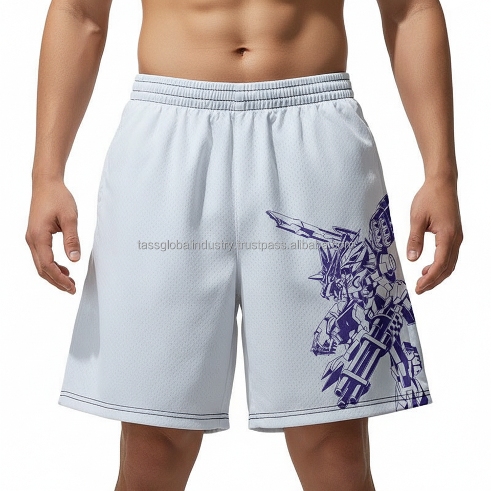 กางเกงขาสั้นตาข่ายผู้ชายขายส่ง น้ำหนักเบา รับผลิตตามแบบ OEM ลายเปลวไฟสีน้ำเงิน รุ่นซัมเมอร์ 2026 กางเกงกีฬาออกกำลังกาย