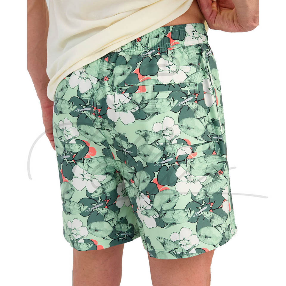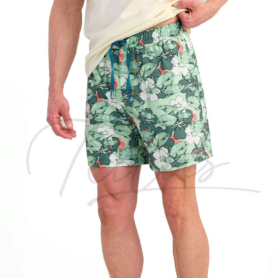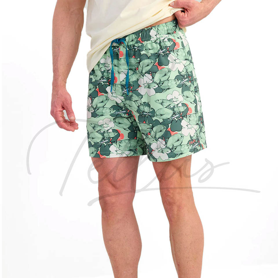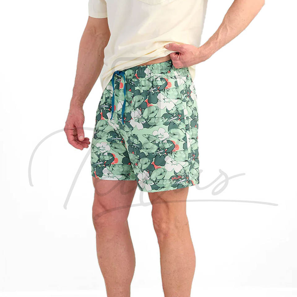 กางเกงขาสั้นชายลายทางกันน้ำ ยืดได้ ผลิตจากโพลีเอสเตอร์/คอตตอน มีเชือกผูกเอว เหมาะสำหรับเล่นน้ำทะเลและเล่นเซิร์ฟ ขายส่ง