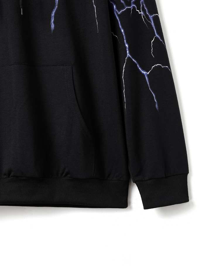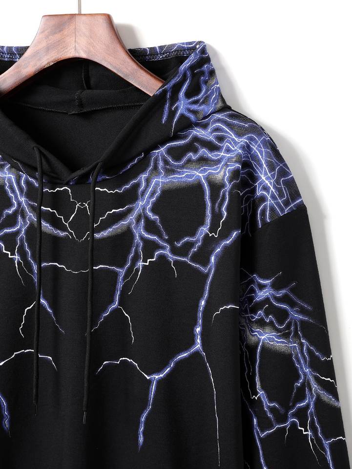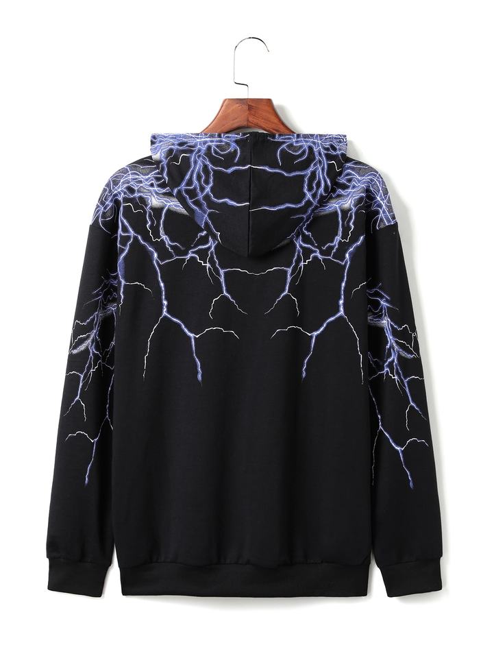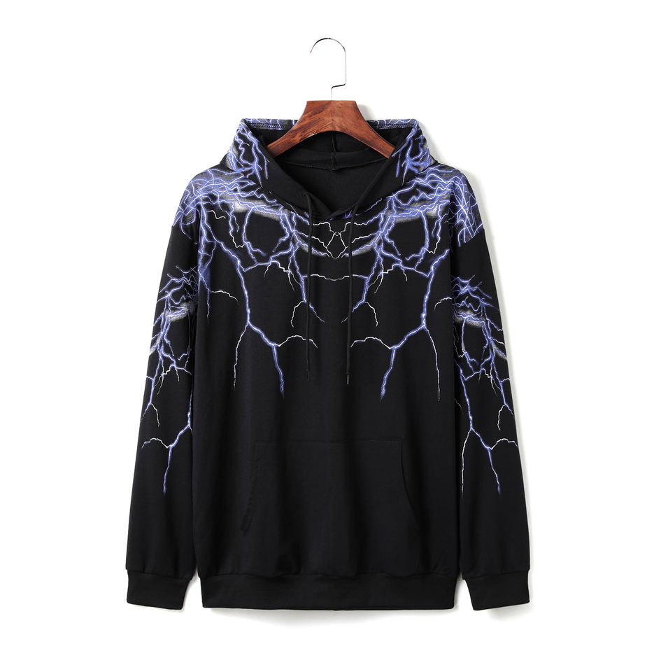 เสื้อฮู้ดดี้ผู้ชายแบบขายส่ง พิมพ์ลายซับลิเมชั่นตามสั่ง ดีไซน์เรียบง่ายสำหรับฤดูหนาว ลายพิมพ์สายฟ้า ปิดด้วยเชือกผูก ระบายอากาศได้ดี ผลิตจากโพลีเอสเตอร์ 100%