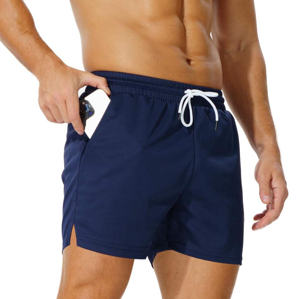 กางเกงขาสั้นผู้ชายเอวยางยืดยาวถึงเข่าสีทึบกางเกงขาสั้นลำลองสำหรับฝึกซ้อมการเพาะกายและวิ่ง