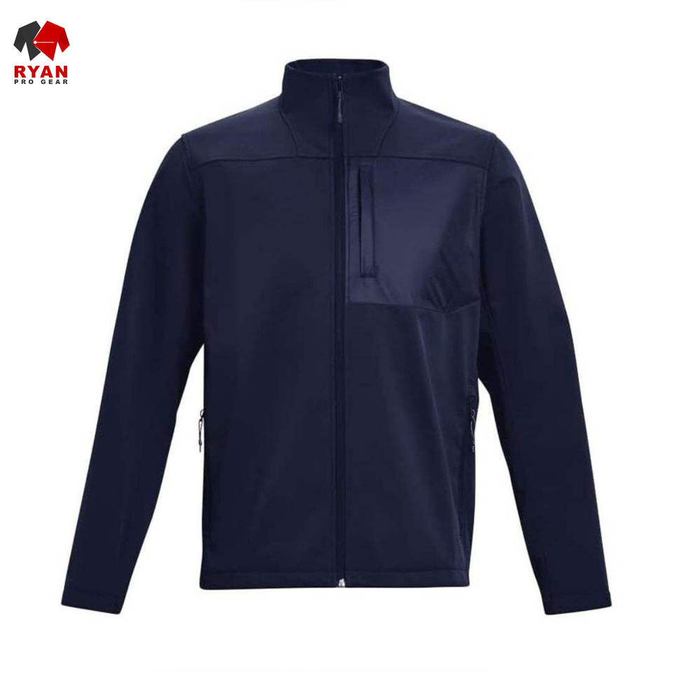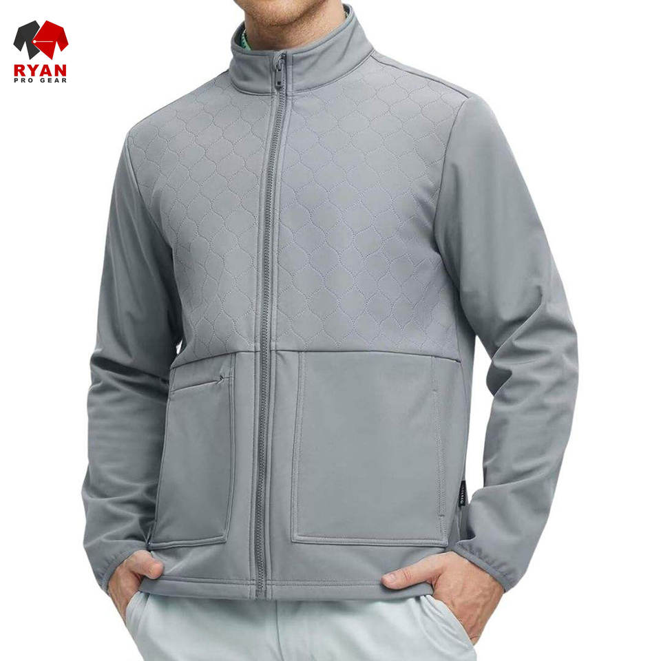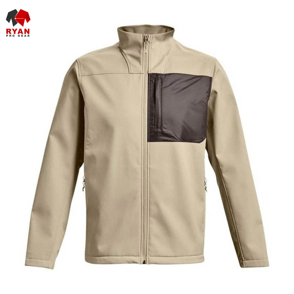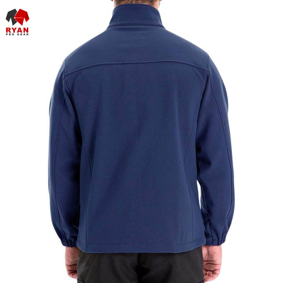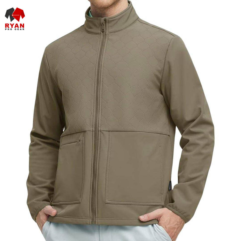 เสื้อแจ็คเก็ตซอฟต์เชลล์ผู้ชายแบบขายส่ง กันลม กันน้ำ ระบายอากาศได้ดี ดีไซน์เรียบง่าย พร้อมโลโก้และกระเป๋าแบบกำหนดเองได้