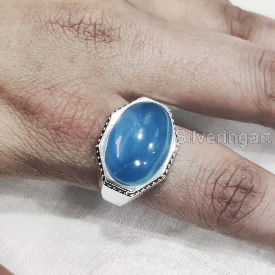 ขายส่งแหวนผู้ชายสีฟ้าธรรมชาติ Chalcedony หินอัญมณีทุกขนาดออตโตมันทำด้วยมือเครื่องประดับ925แหวนเงินสเตอร์ลิง