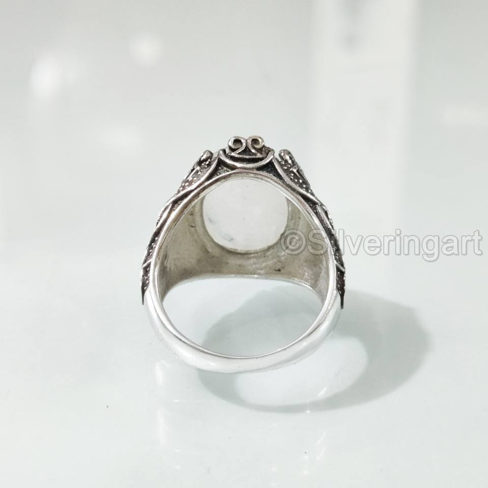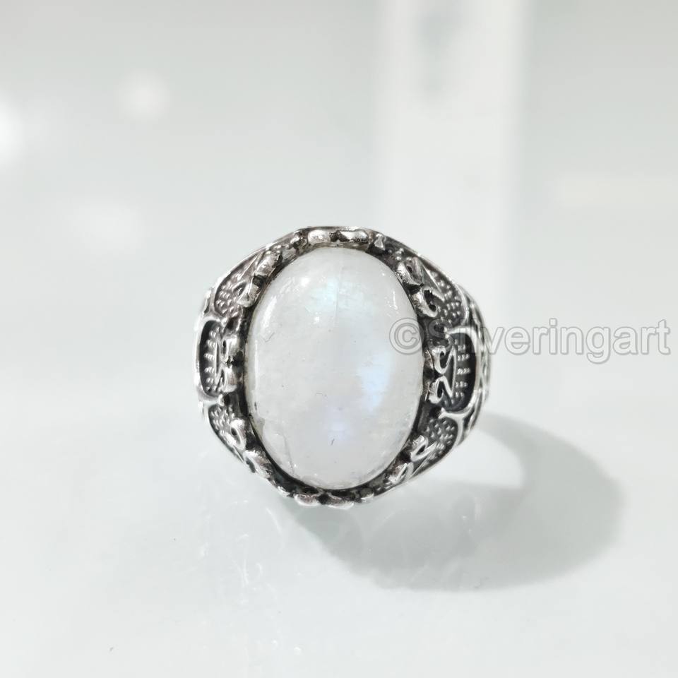 แหวนผู้ชายขายส่ง แหวนพลอยมูนสโตนสีน้ำเงินธรรมชาติ แหวนพลอยประจำเดือนเกิดเดือนมิถุนายน เครื่องประดับอาหรับ แหวนเงินแท้ 925
