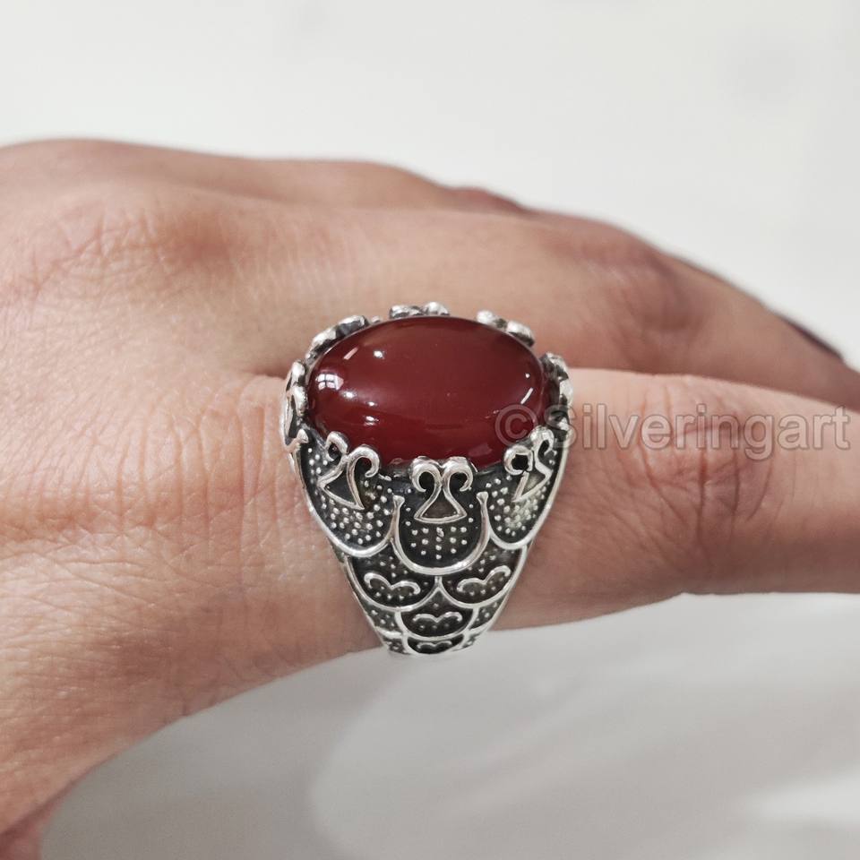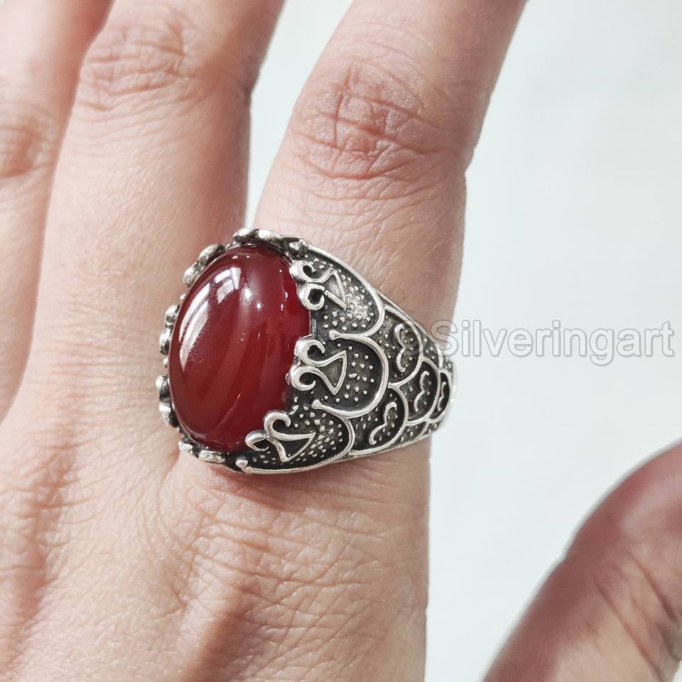 แหวนสำหรับผู้ชายขายส่งแหวนพลอยโอนิกซ์สีแดงธรรมชาติแหวนประดับหินทุกขนาดเครื่องประดับตะวันออกอาหรับ925แหวนเงินสเตอร์ลิง